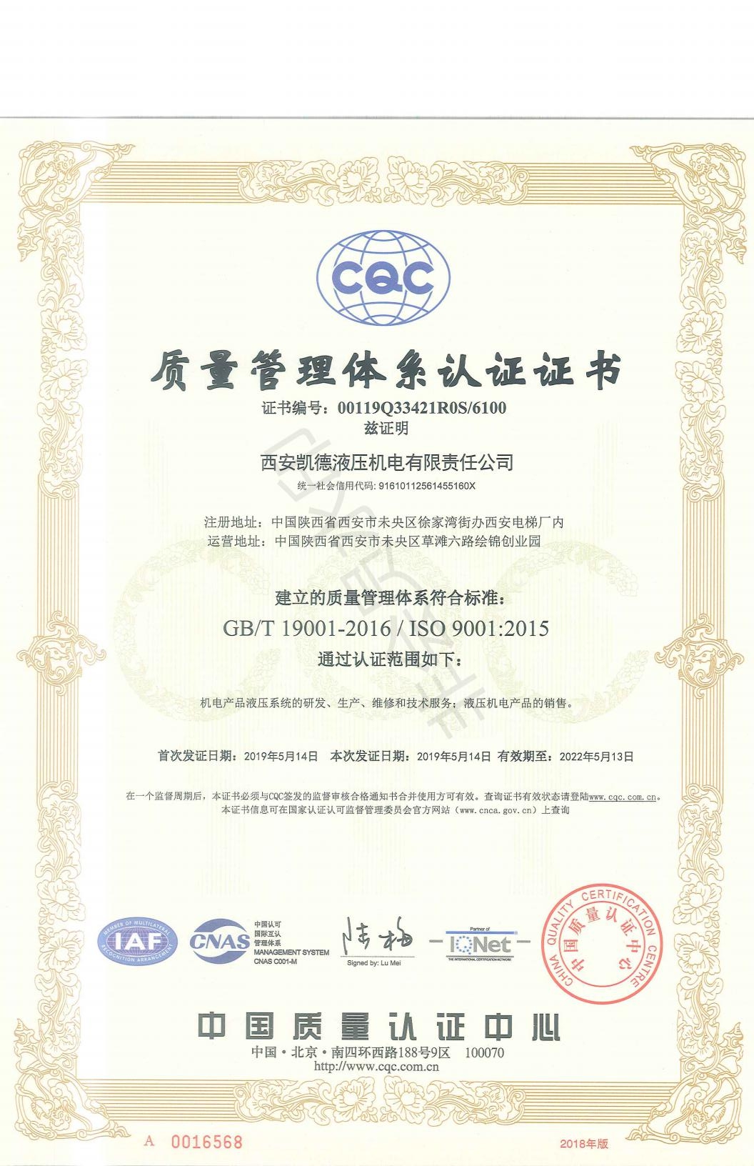 長(zhǎng)期以來,我公司始終將”技術(shù)領(lǐng)先、品質(zhì)卓越、服務(wù)專業(yè)、客戶滿意”作為企業(yè)發(fā)展的質(zhì)量方針。各部門嚴(yán)格按照質(zhì)量管理體系文件要求,做到持續(xù)改進(jìn),不斷提升,給客戶提供更優(yōu)質(zhì)的產(chǎn)品和服務(wù)為宗旨的企業(yè)發(fā)展理念。最終專家組成員一致認(rèn)定西安凱德液壓的質(zhì)量管理體系符合認(rèn)證要求,運(yùn)行有效,順利通過了ISO9001:2015管理體系評(píng)審,進(jìn)一步證明了我公司在液壓傳動(dòng)領(lǐng)域技術(shù)、銷售和服務(wù)的質(zhì)量和管理水平。并于2019年5月14日為我公司頒發(fā)證書,有效期至2022年5月13日。