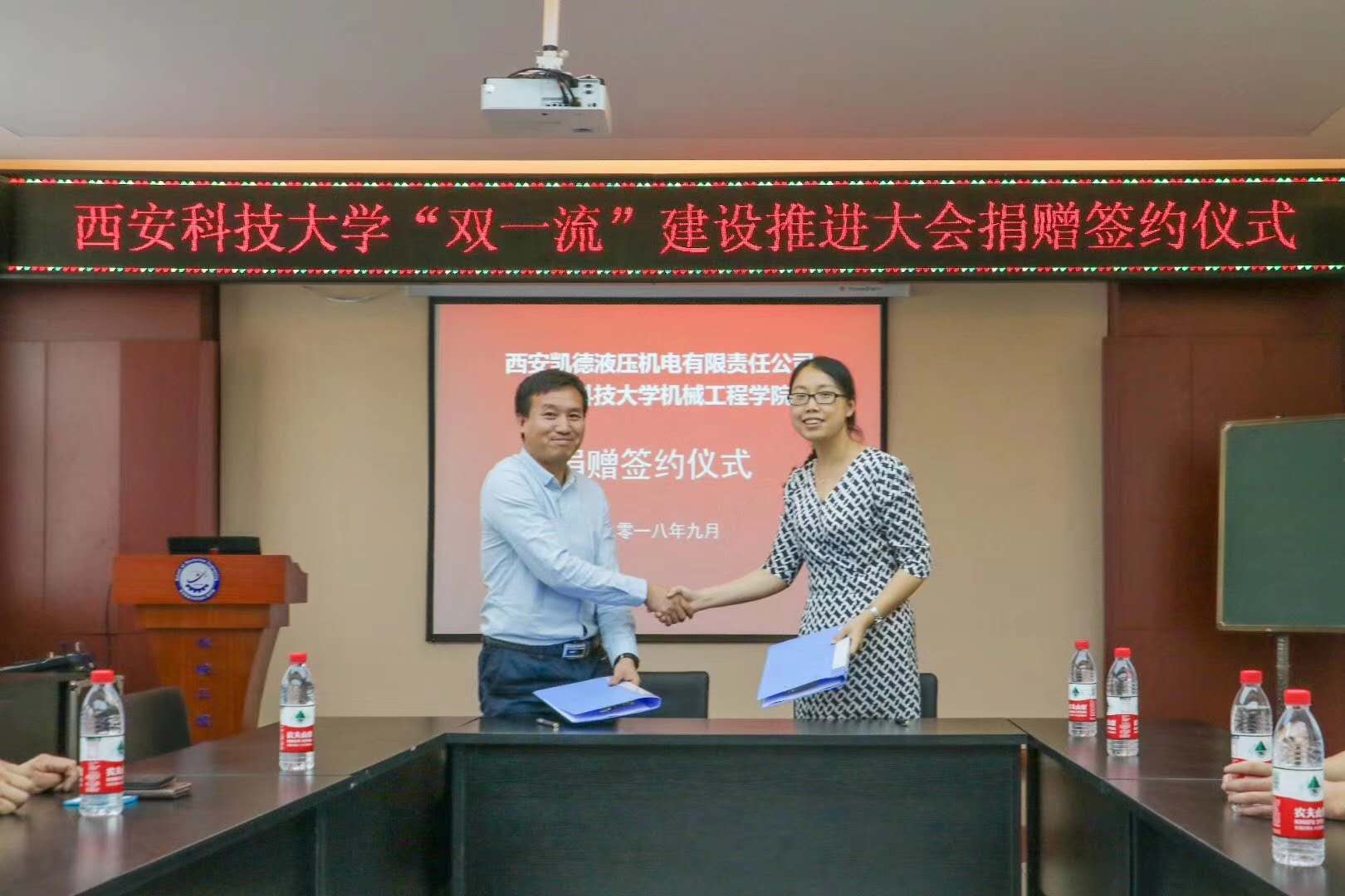 9月14日上午,為慶賀西安科技大學(xué)六十周年校慶,我公司總經(jīng)理高彥軍、技術(shù)總監(jiān)胡松剛一行代表西安凱德液壓來(lái)到西安科技大學(xué)臨潼校區(qū)驪山校園,向機(jī)械工程學(xué)院捐贈(zèng)了液壓馬達(dá)、液壓泵等液壓元件解剖件。機(jī)械工程學(xué)院黨委書(shū)記汪衛(wèi)兵,院長(zhǎng)張旭輝,黨委副書(shū)記李婉麗,副院長(zhǎng)趙栓峰,副院長(zhǎng)寇發(fā)榮等相關(guān)負(fù)責(zé)人及部分學(xué)生參加了簽約儀式。