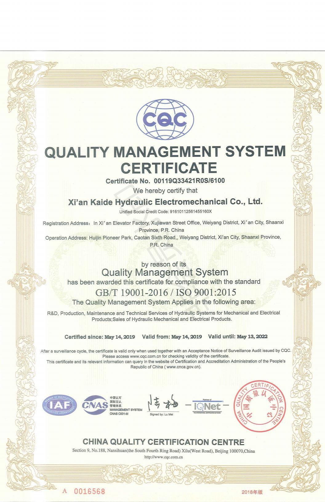 長(zhǎng)期以來,我公司始終將”技術(shù)領(lǐng)先、品質(zhì)卓越、服務(wù)專業(yè)、客戶滿意”作為企業(yè)發(fā)展的質(zhì)量方針。各部門嚴(yán)格按照質(zhì)量管理體系文件要求,做到持續(xù)改進(jìn),不斷提升,給客戶提供更優(yōu)質(zhì)的產(chǎn)品和服務(wù)為宗旨的企業(yè)發(fā)展理念。最終專家組成員一致認(rèn)定西安凱德液壓的質(zhì)量管理體系符合認(rèn)證要求,運(yùn)行有效,順利通過了ISO9001:2015管理體系評(píng)審,進(jìn)一步證明了我公司在液壓傳動(dòng)領(lǐng)域技術(shù)、銷售和服務(wù)的質(zhì)量和管理水平。并于2019年5月14日為我公司頒發(fā)證書,有效期至2022年5月13日。